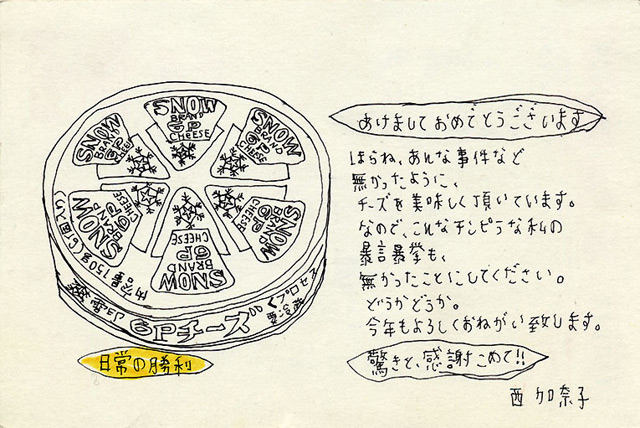 明後日は嬉しい席に呼ばれている/第24回織田作之助賞に西加奈子「通天閣」(筑摩書房)が受賞した/大阪で開催する授賞式に友人らと行く予定/大阪を離れて小説家宣言した頃に貰った年賀状を見つけた/その年賀状には何故か?雪印の6Pチーズのイラストが描かれている/「日常の勝利」とも書かれている/あの頃に理解出来なかったコトが今なら少し理解出来るw/生きるコト/表現するコト/日常に潜んでいるコトから逃げずに生きようと彼女に教えてもらった/あのクソ暑い沖縄の夜/コンビニの前で弁当を買ってホンダートらと食った日が懐かしいw/やれば出来る/願いは叶う/明日は来ると云う歌を聴く